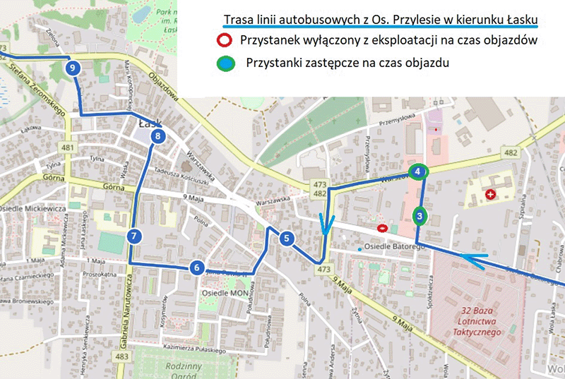Trasa autobusów w kierunku os. Przylesie i Pabianic zgodnie z wcześniej wyznaczonymi objazdami przez Plac Piłsudskiego w Łasku.